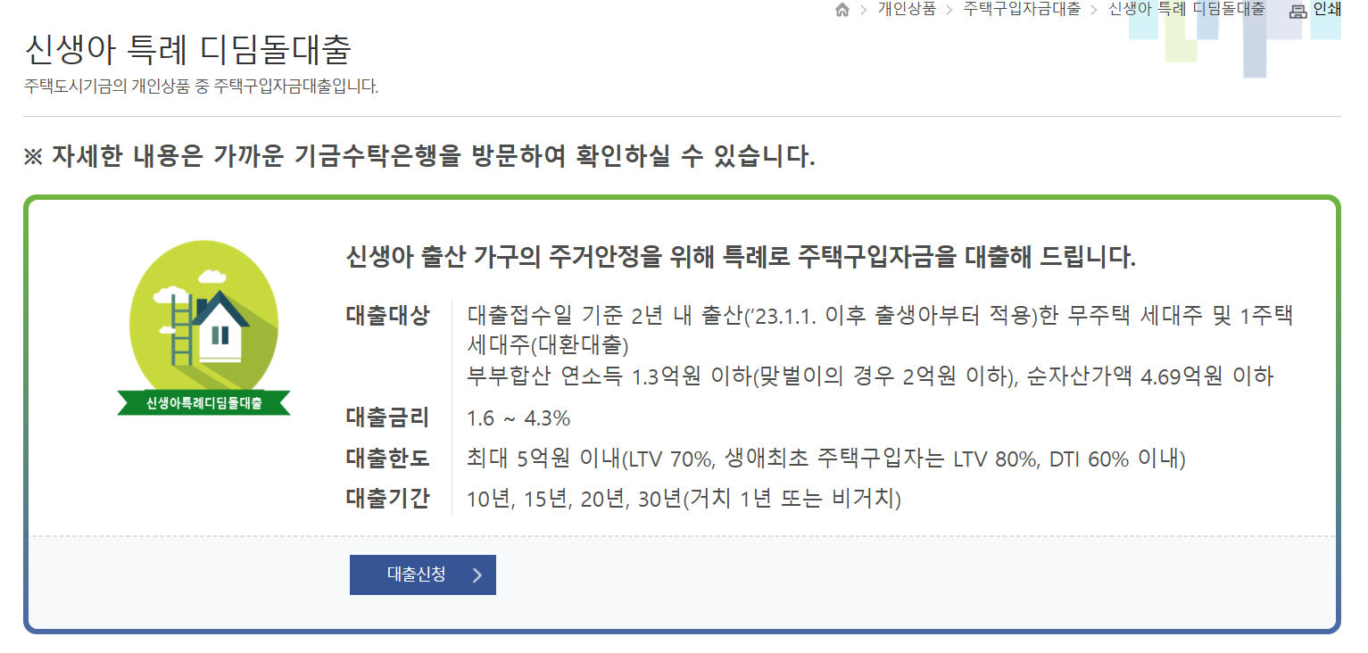대출 안내 < 신생아 특례 디딤돌대출 < 주택구입자금대출 < 개인상품 | 주택도시기금